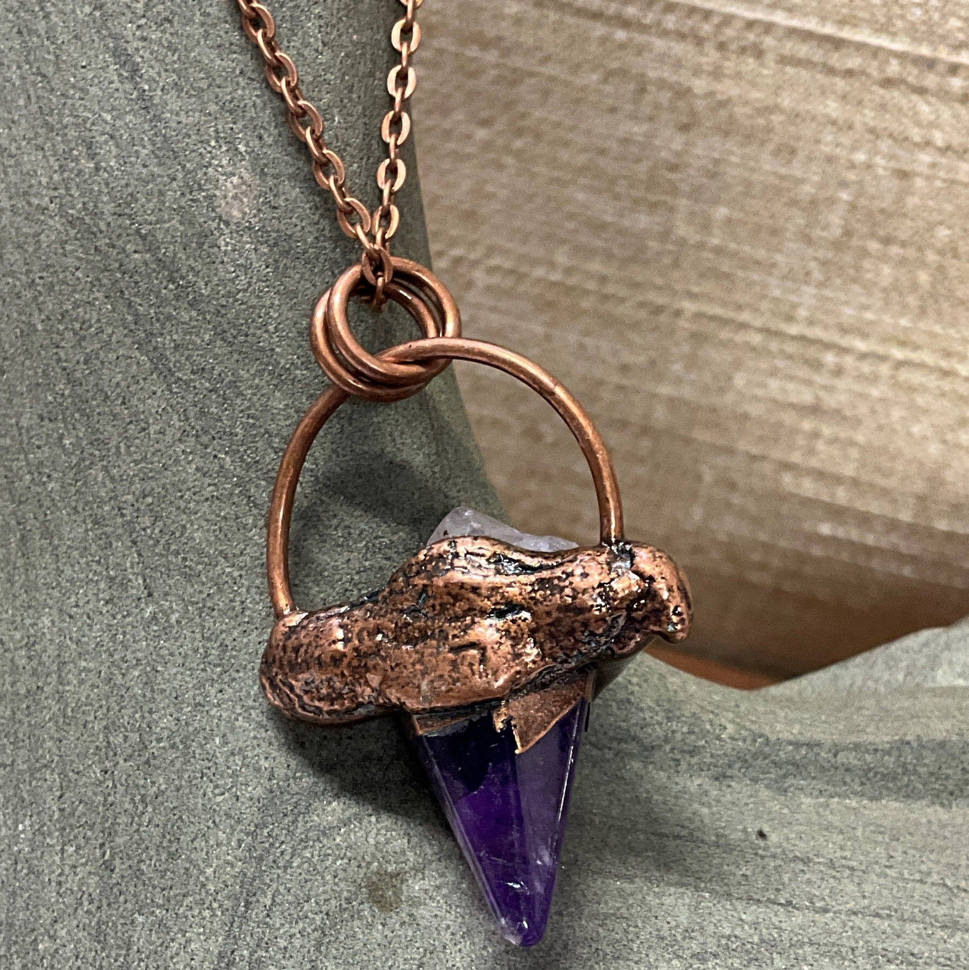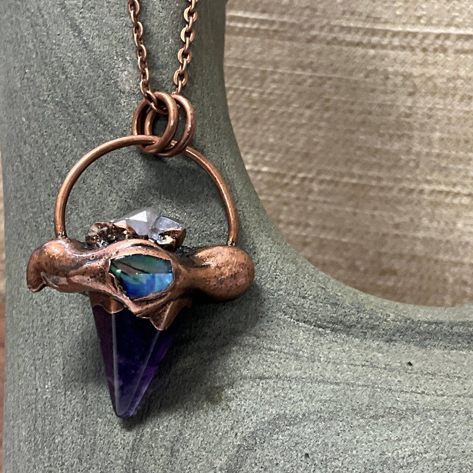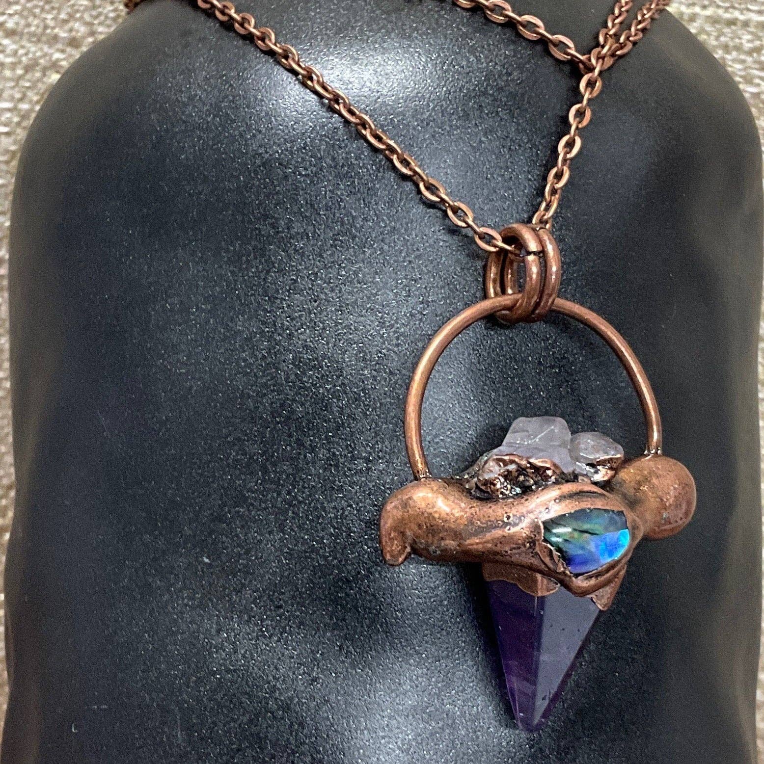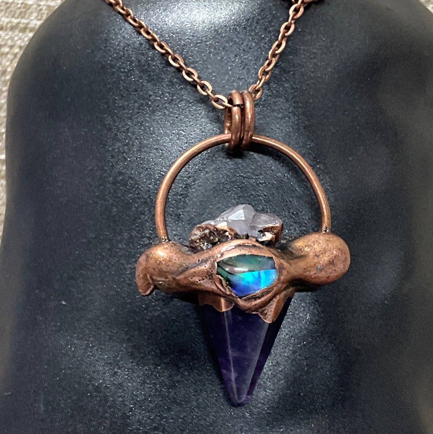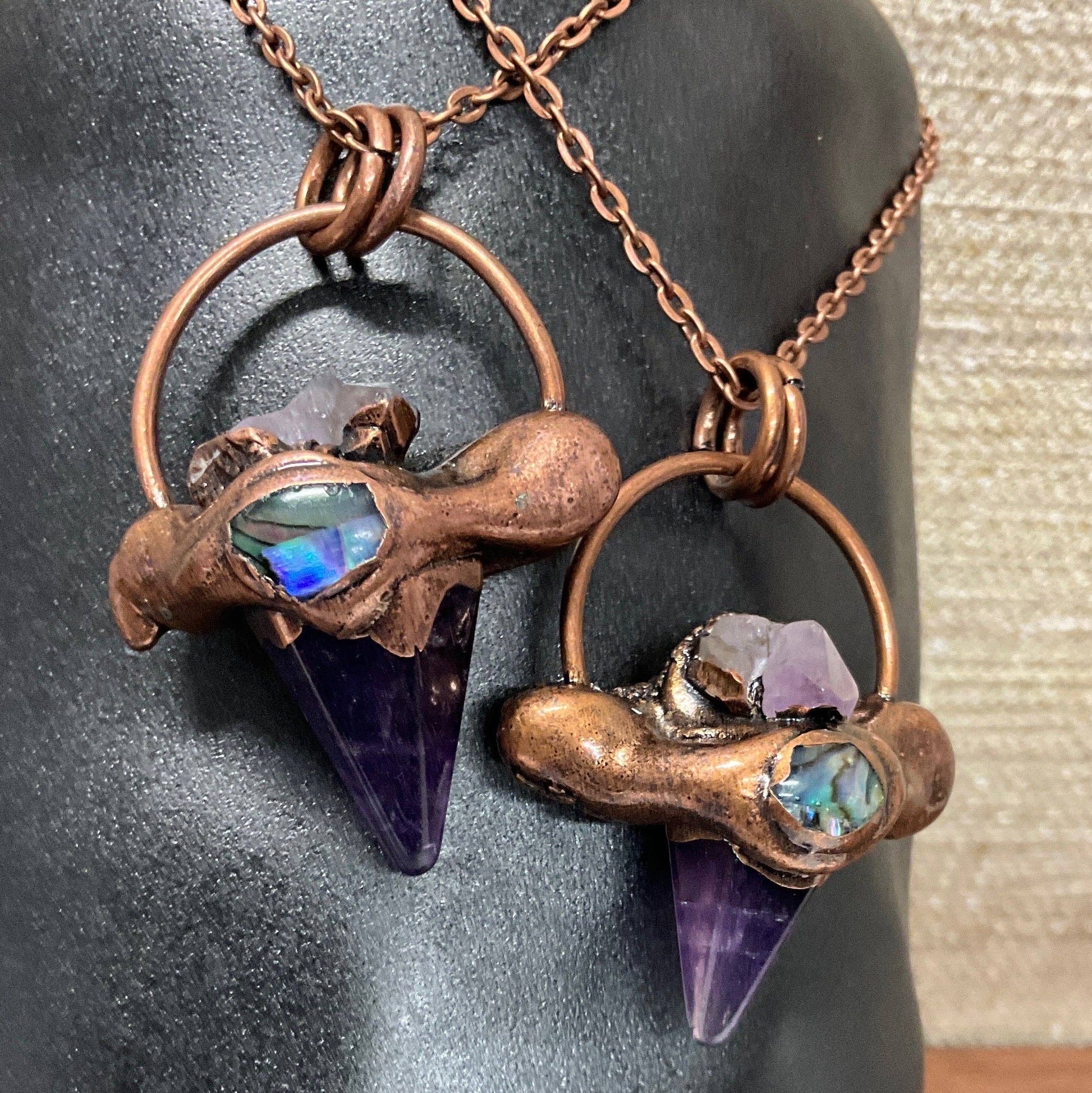 A colorful and meaningful necklace. Amethyst comforts, nurtures and heals. The hexagon is a sacred shape with 6 sides symbolizing love, compassion, harmony and balance. Each piece is rendered in antique copper with a touch of abalone for magnificent color.