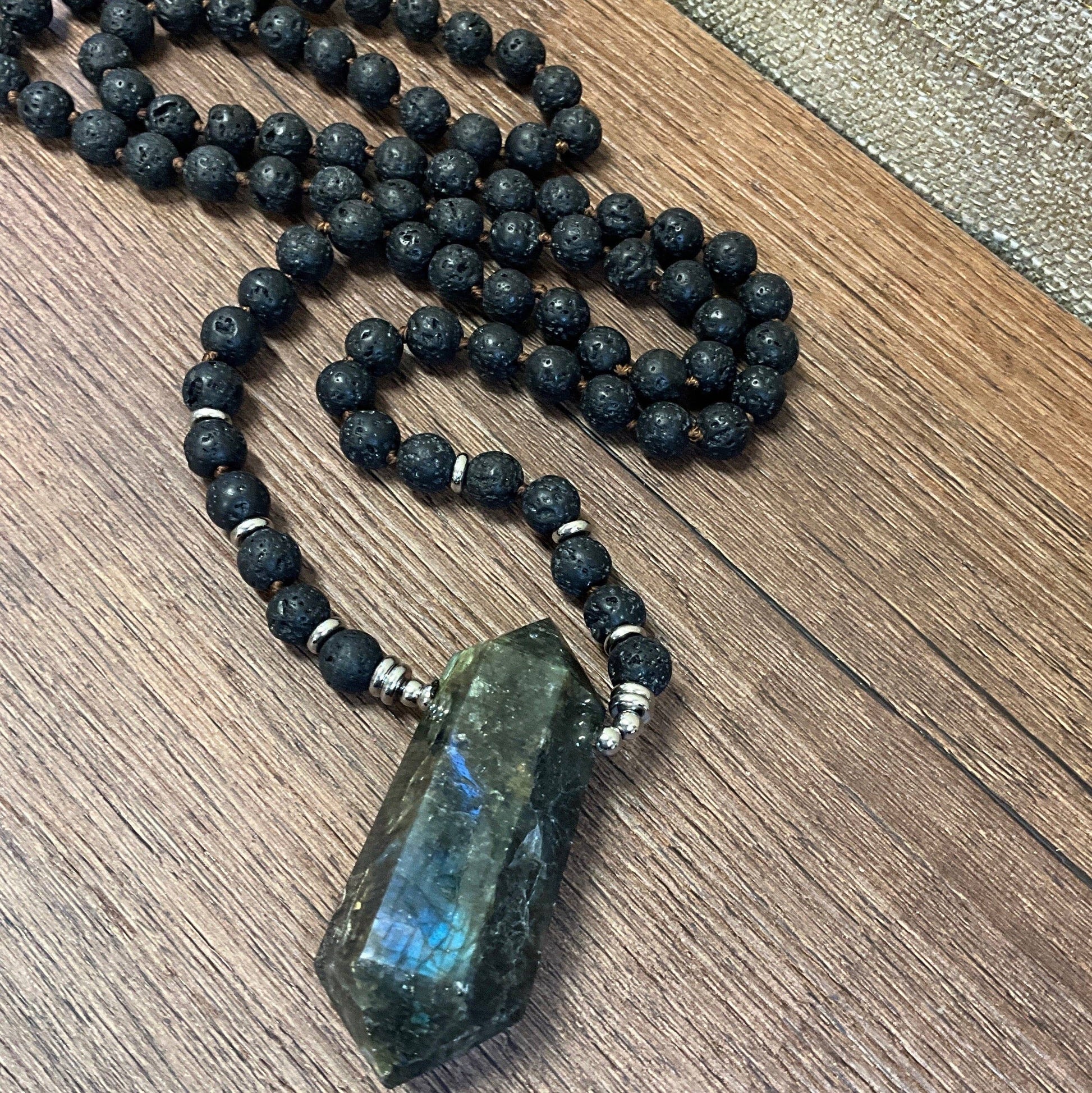 Textured and strong. A powerful statement necklace pairing transformative labradorite with protective lava stone.