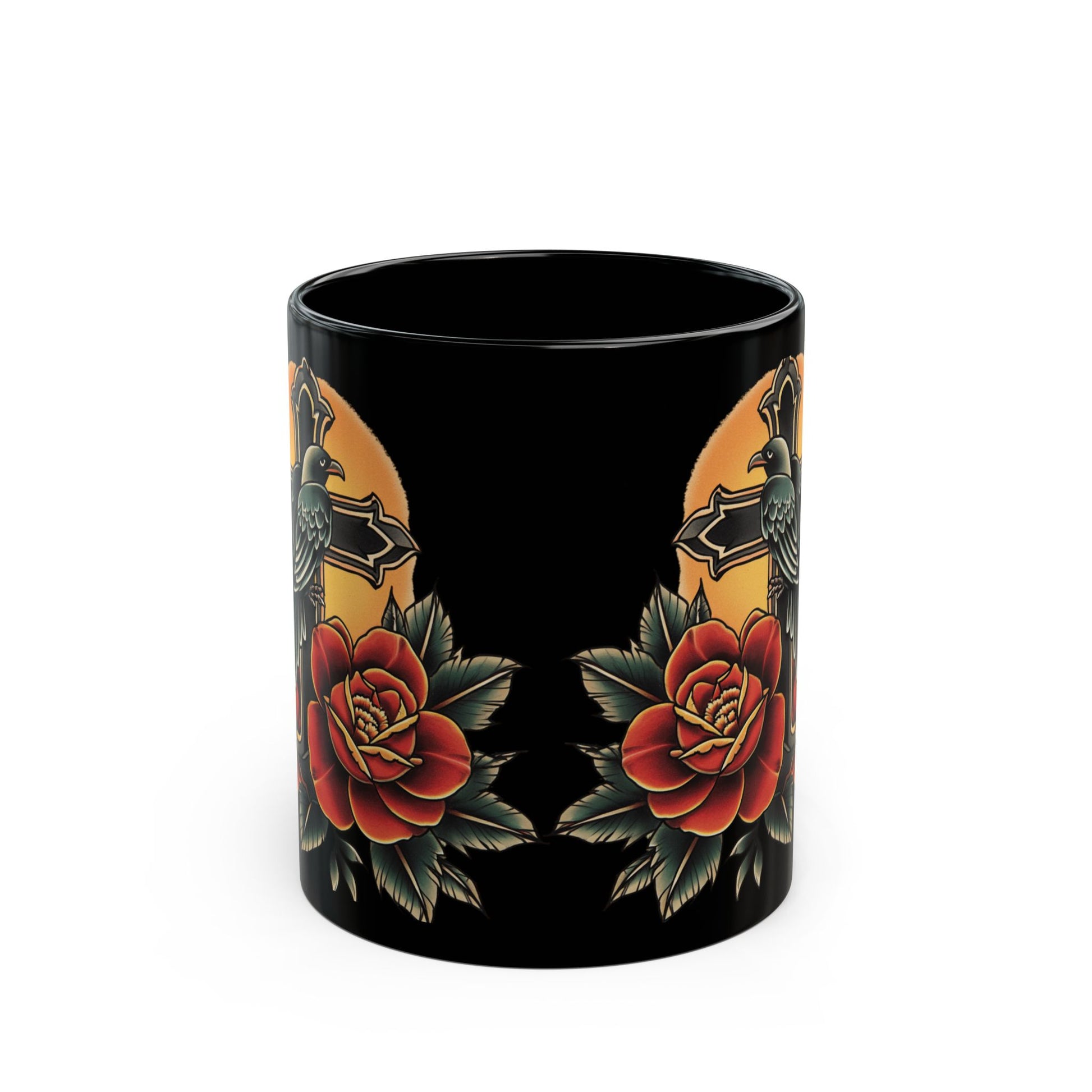 Raven Tattoo-Inspired Black Mug: Bold Floral Design, Gothic Decor, Unique Gift for Art Lovers, Perfect for Coffee & Tea